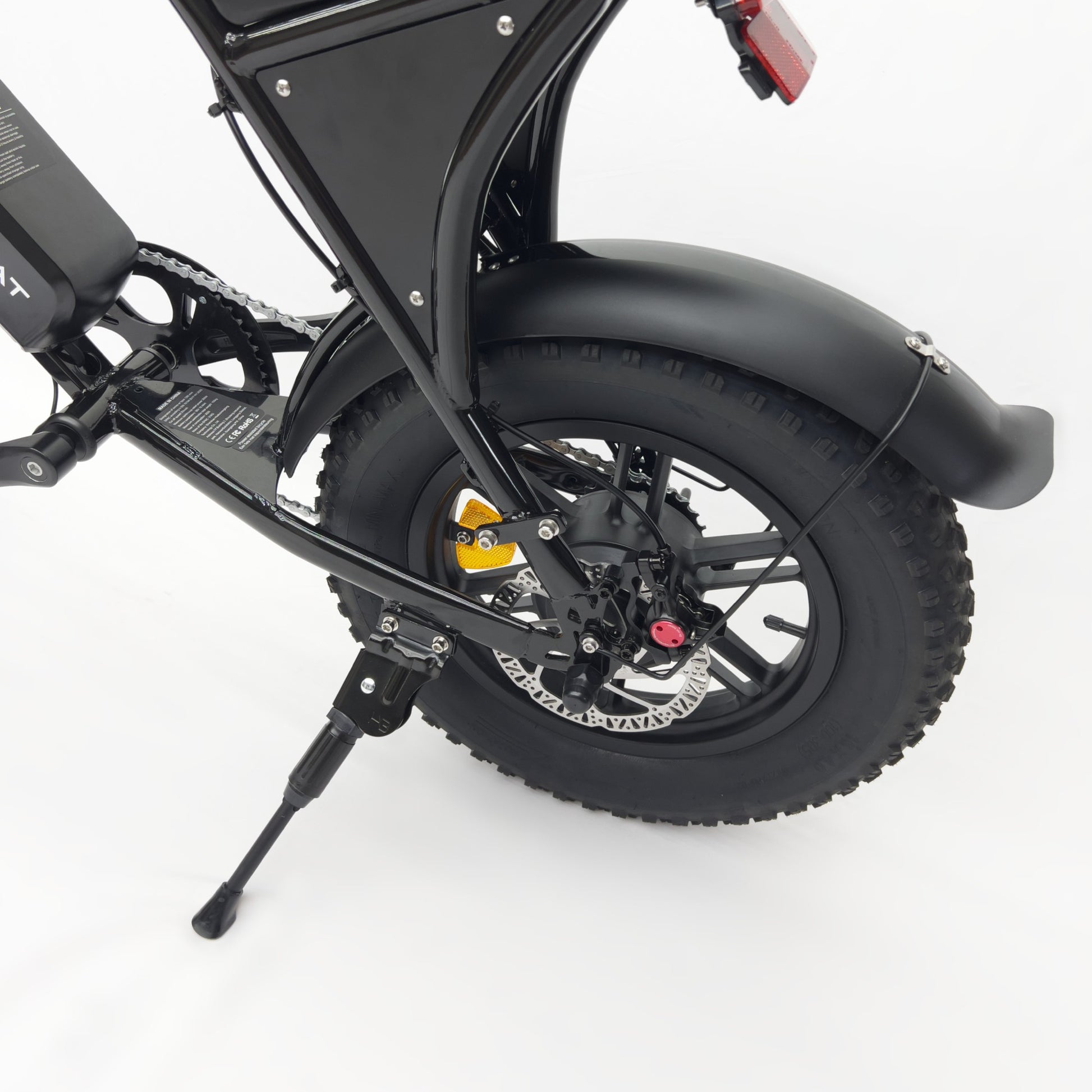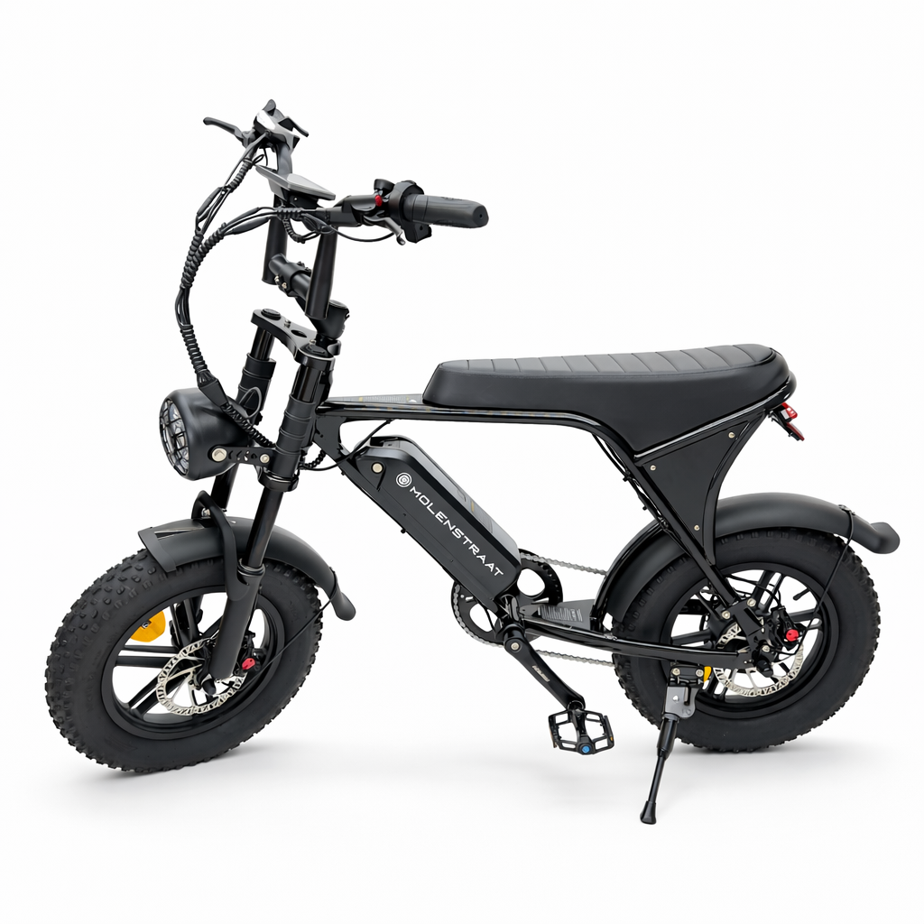 The Molenstraat Mini is a 16inch wheel Fatbike with a smaller frame size, which delivers responsive performance with its 250W motor (25 km/h max). It's dual front suspension ensures confident handling on varied terrain. The removable 36V 10.4Ah battery provides up to 50 km of range per charge, while 7-speed Shimano gears adapt to your riding conditions. Hydraulic disc brakes ensure reliable stopping power, and integrated LED lighting with turn signals enhances visibility and safety. Color LCD display with built-in alarm adds security when parked. Engineered for both daily commutes and weekend exploration.